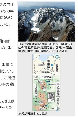 《每日新聞》報導,立山連峰所發現的冰體,經日本雪冰學鑑定,確認是日本第一條冰河;該研究成果將刊載於5月發行的 學會雜誌《雪冰》上。雪冰學會是日本唯一認定冰體是否為冰河的機關。