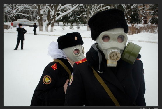 ▼俄羅斯「蘿莉士兵」戴防毒面具。(圖/取自紐約時報)