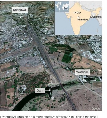 布萊爾利用Google地球的衛星地圖,以加爾各答為中心畫圈,最後認定他要找的城鎮叫做坎得瓦(Khandwa)。布萊爾利說,「當我知道是坎得瓦後,就把畫面放大,一路瀏覽到以前的小鎮及常玩耍的瀑布」。