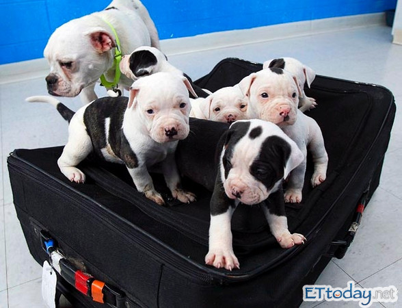 原來有一個狠心的狗主人,把這六隻可愛的小狗與它們的狗媽媽關在圖中的皮箱裡,還拉上拉鏈,丟在垃圾桶旁。大概是被人發現了,才被救了出來,送往慈善團體安置。每隻小狗都面露著驚恐。