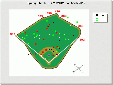 下圖(圖/texasleaguers.com)則是老爹本季的打擊落點分佈圖,我們可以看到許多安打(Hit)是落在反方向的左外野,過去習慣調整布陣的對手教練,恐怕要重新改變對這位36歲老將的想法了。