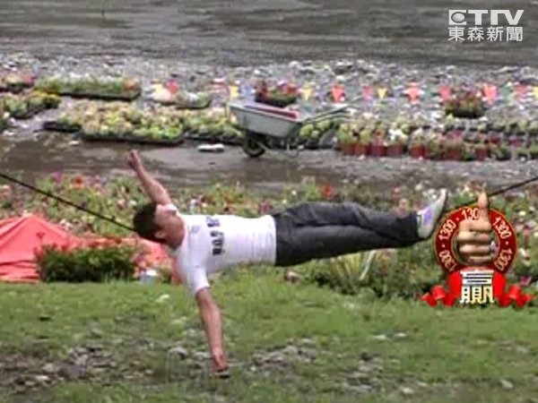 小龍女輕功飛上細繩,先下劈一字腿、接著側躺細繩,飄飄倩影讓人印象深刻。而宜蘭也出現了位男版小龍女,同樣愛躺在細繩上睡大頭覺。在兩棵樹上綁上繩子,天地間便有了安身之所,該位老兄一派輕鬆,還能閉目養神,而這對他來說只是小菜一碟。
