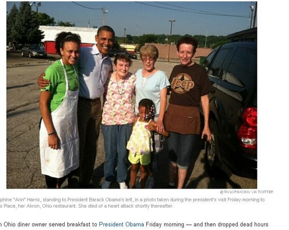 美國總統歐巴馬(Barack Obama)近來為競逐連任,前往俄亥俄州進行宣傳。日前歐巴馬到一家餐廳吃早餐,70歲的女老闆哈里絲(Josephine “Ann” Harris)疑似太激動興奮,與歐巴馬合照後沒幾個小時,竟突然心臟病發猝死。