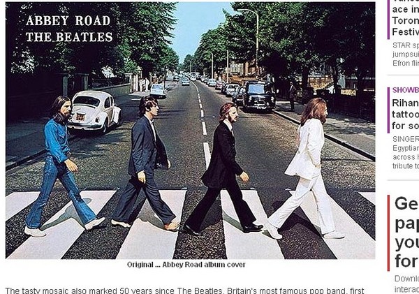英國一位藝術家保羅‧貝克(Paul Baker),在日前為了慶祝披頭四成立50周年,精心用食物原料拼出披頭四的經典專輯《艾比路》(Abbey Road),甚至考慮到成員保羅‧麥卡尼(Paul McCartney)是素食者,還特地選用磨菇片拼成他的肖像。