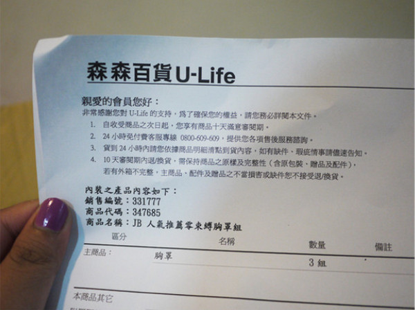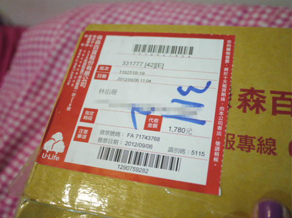 那天我是半夜訂購了,才隔了一天就馬上收到了森森百貨的包裹!在電話中客服人員還會詢問到很貼心的問題[到貨前是否需要請司機先跟你聯繫],像我就是選擇貨到付款,若事先聯繫的話就可以看錢包是否夠錢,可以事前去領錢了!而我也選擇將發票送給客服所說的捐贈機構可以買東西又做好事,真的很棒!