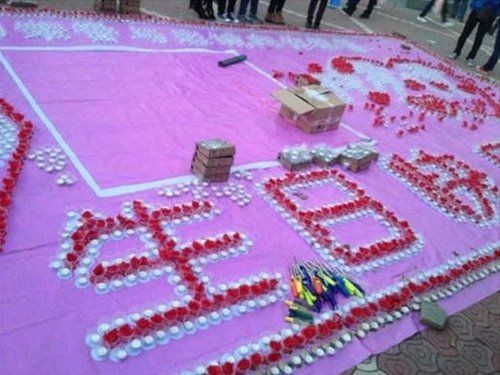 微博附上的照片顯示,穿著西裝的男子在宿舍樓下靜靜等待,約200平方公尺的粉色底部上,中間夾著玫瑰花的蠟燭擺出心形及「生日快樂」字樣,還有對女孩的告白。