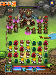 Puzzle Saga 的玩法就跟普通的寶石方塊一樣,交換小兵位置,將三種相同顏色 (兵種) 的小兵排列成排,接著就會看到小兵們 咻~ 的衝出去攻擊前方敵人,如果成排的是弓箭手或魔法師等兵種,就會看到他們射出箭矢或魔法攻擊隨機的敵人,只要連線速度夠快,可以看到小兵們一團團的攻擊,爽快度相當高!