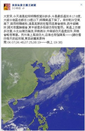 東森氣象主播王淑麗1日表示,清晨淡水低溫17.8度,北部大部分地區也都在19度以下,高屏地區因乾冷空氣南下降雨明顯緩和,西部則有太陽露臉機會,東半部雲多局部短暫雨;氣象達人彭啟明也在臉書透露,這波的鋒面雲系一直被後面冷空氣南推,全台才會開始轉冷,不過接下來幾天溫度會再回升,天氣轉晴。
