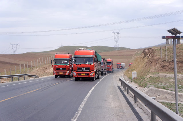 翻過山後,緊接著就是長達14公里的長下坡。路況雖然很棒,但在這裡可別急著衝下山!跟我們一樣想翻過山的車可多了,不過特別是小車沒幾輛重卡滿天下,一輛輛載滿貨物的重卡,就算爬得吃力也要佔據對向車道來超車。