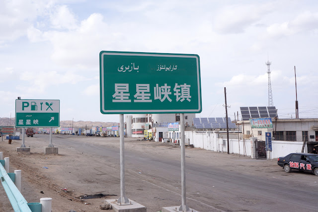 差不多五點半左右,在前方幾座矮丘讓出眼前的視線後,我們終於到達了神祕的星星峽鎮。這裡比起衛星空拍看到的還來得熱鬧許多,有派出所、超市、餐館、修車廠還有賓館,幾乎應有盡有,但價錢也反映出明顯的戈壁行情,這裡的飲用水跟柳園一樣都是用火車拉來的,所以物價會高人一等也就變得理所當然了。