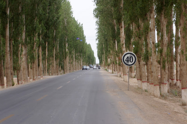 重新走上復活的G312國道上,有巨樹摻天的路樹簇擁之下前進。一棟棟風格強烈的阿拉伯清真寺出現在路上,路上婦人雖然臉沒有蓋上面紗,但頭上都開始繞起了圍巾,來到沙漠背後的神秘世界後,宛如來到了中東一般,感受到很特別的異國風情!