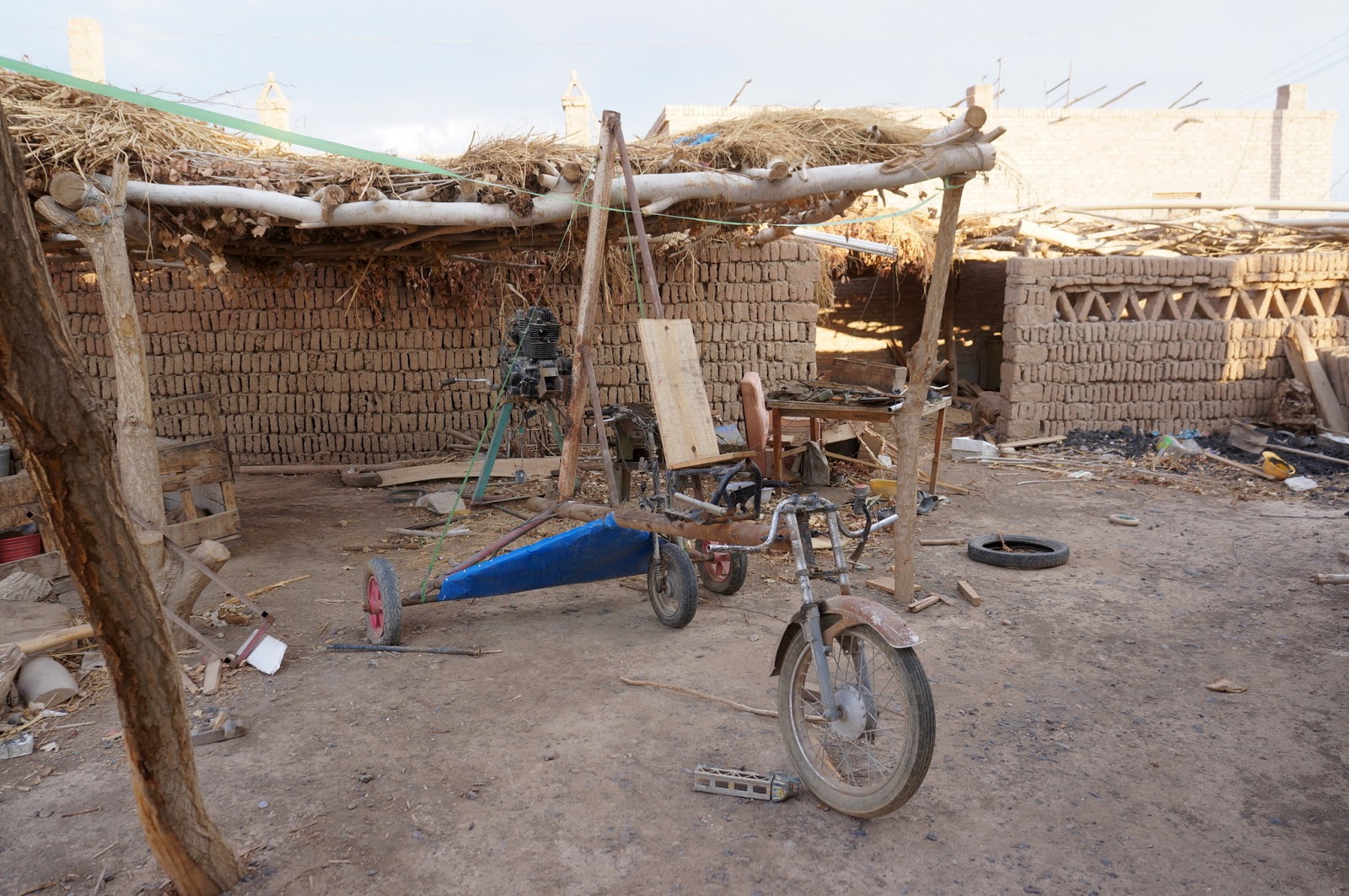阿合買提大哥的家以及晾房是用土製方塊砌成的,除了全部自己蓋之外,都是就地取材用當地的土來作為建築的材料。晾葡萄的工作要等到九月才開始,作法就是用鐵絲穿過整棟晾房,上面直接掛著葡萄來曬,等葡萄被自然風乾之後就會掉到地上變成葡萄乾,接著就可以出售了。