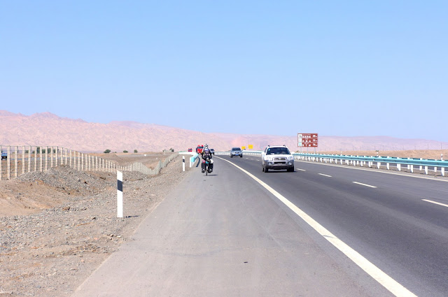 Fleur今天又要趕去吐魯番辦延簽,而武洋也陪她先走了,剩下我們三人等休息夠了才懶洋洋的再次上路。才離開小鎮G312國道又再次被壓在高速之下不見蹤影,眼前的高速護欄有道缺口,一眼望過去不上高速也沒路可走,但上了又必須逆向行駛,在旁工作的當地人說道:『沒事!上去後馬上有地方可以再走回到順向車道...』,以最快的速度離開逆向車道,直到車道間的護欄消失後,一次在高速上穿越四條車道回到安全的路肩,等一切都回到正軌後才得以鬆一口氣。