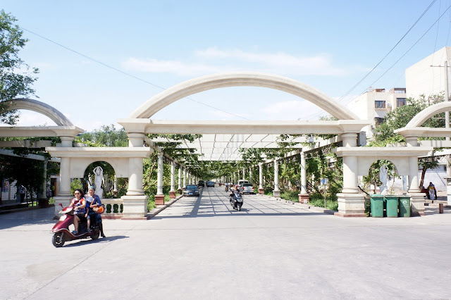 吐魯番的高速看不到交流道,只有一個個十字路口,跟走在一般道路沒有太大的差別。這裡民房幾乎家家樓頂都有用來風乾葡萄的晾房,街道上有葡萄藤蔓大道,都非常具有當地特色。另外無論是建築的設計、文字和語言也都帶有濃濃的異國風味,感覺就像身處中東地區的城市一樣讓人目不轉睛。
