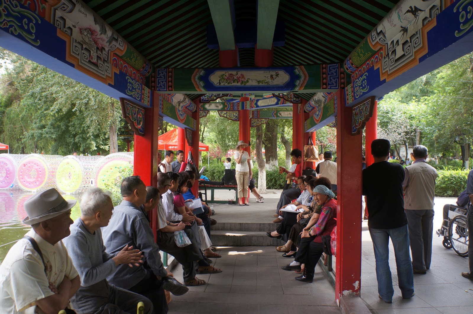 不喜歡打牌的,有很多人會聚集在湖邊的涼亭下玩音樂。有人拉著二胡,有人演奏琵琶或古箏,有人演奏當然也有人唱戲,一個小型的中式演唱會就開始進行起來,別來無事在這座著聽上幾曲也別有情趣。