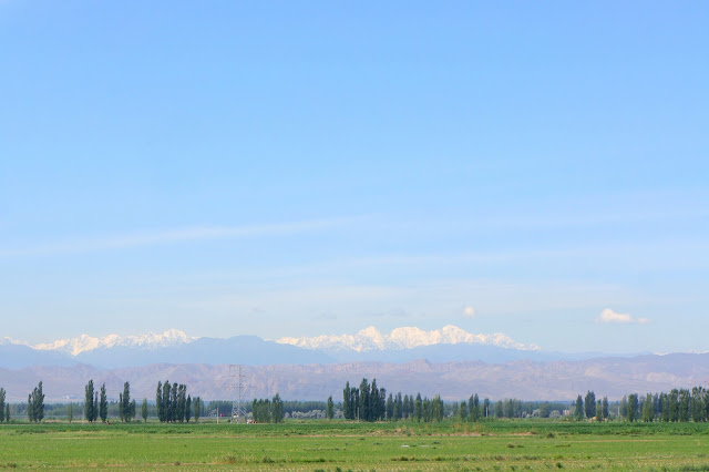 到了烏魯木齊後天山已經從我們的北邊轉變到南邊了,山頂一樣冰雪覆蓋,太陽還是一樣高高掛著。多了草地覆蓋平原大地,而逆風擋路也變成了徐風吹過,渾身都跟著涼快起來。舒服的環境下騎車腳步不知不覺會越轉越快,正好把昨天少騎的里程補一些回來。