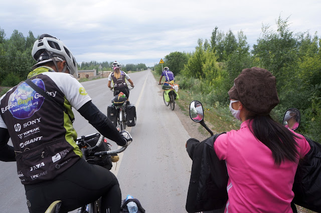 越過最後一道丘陵地形後,我們進到塔城盆地。盆地中一樣一望無際的大草原風光,是全大陸第二大平原草原,真是一塊令人嚮往的人間淨土。走在進城的路上,我只顧著用SONY相機的全景模式記錄下周遭的美好,走在前面的武洋竟然就和一位騎著電動車的黃老師聊了起來,聊到後來黃老師變就成為我們的黃導遊了!先是帶我們到她服務的學校逛逛,接著又帶我們找到縣城裡的車店進行保養,最後我們就直接住進她家了!