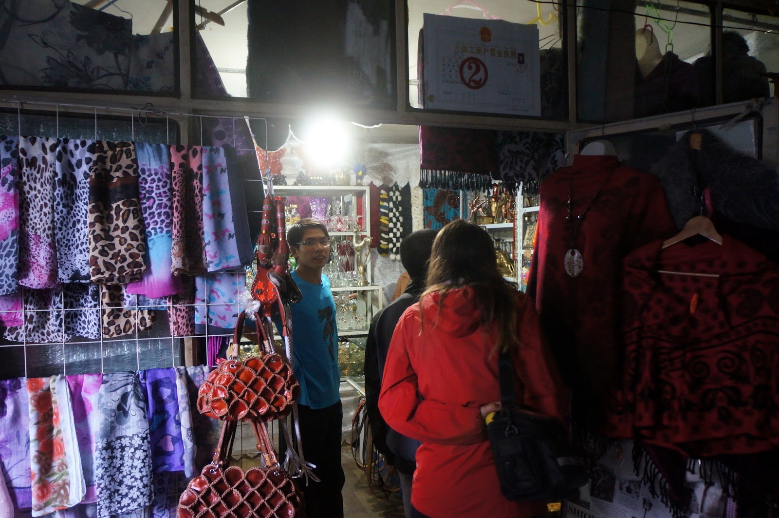 由於周末大多數店家都沒有營業,燈光更顯得陰暗,感覺就像電影裡描繪的黑市場景一般。選了間有營業的店舖進去瞧瞧,從門口到店內擺滿各式各樣異國色彩的各式商品。有部分來自哈薩克的服飾、織品,絕大部分櫃上擺設的都是來自俄羅斯的東西,有熟悉的俄羅斯娃娃、珠寶盒、茶具、裝飾品、皮包、毯子甚至連巧克力都有,實在讓人看得目不轉睛!