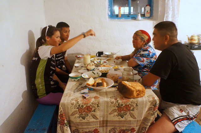 餐桌上一樣的規矩,喝奶茶由女主人服務。跟昨天看到的一樣分成三壺,由Ermek母親來調配比例,觀察老奶奶在倒奶茶時永遠只會裝到碗的1/3高度,由於他們習慣拿碗的時侯大拇指會直接扣在碗的內側拿起,如此特殊的拿法喝起來特別豪邁。不過每次喝完都還要再麻煩人家一壺一壺調配,想再喝都有點不好意思。