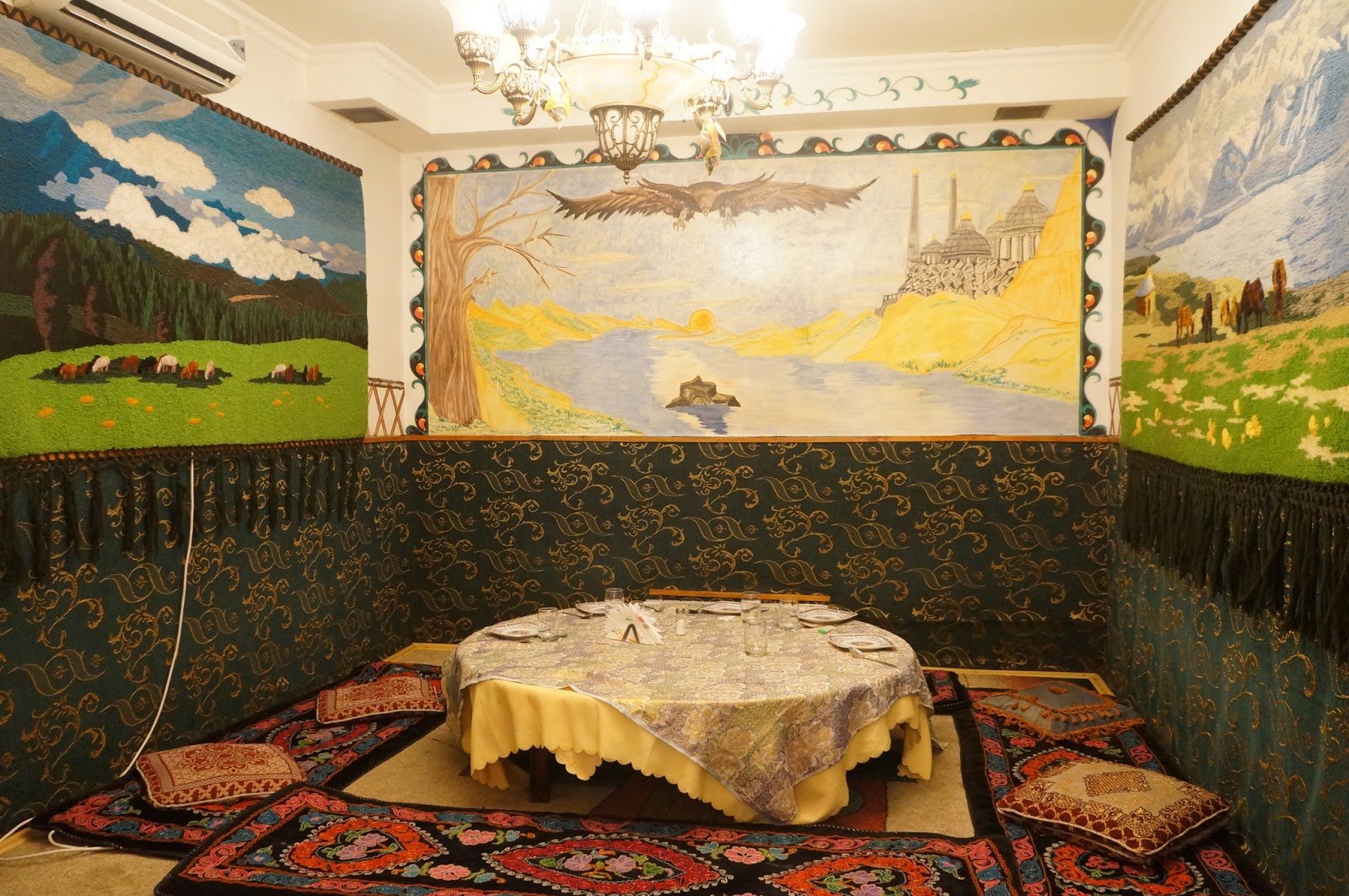 這間餐廳有兩個特別設計的包廂,一個是哈薩克傳統的設計,有矮桌、毯子與壁畫,另一間則是俄羅斯式的房間,西式的桌椅配上俄式瓷器的擺設,簡樸又典雅。瞧這樣的裝飾就感覺這家餐廳的消費應該不低,掃過菜單後更是驗證了這件事...