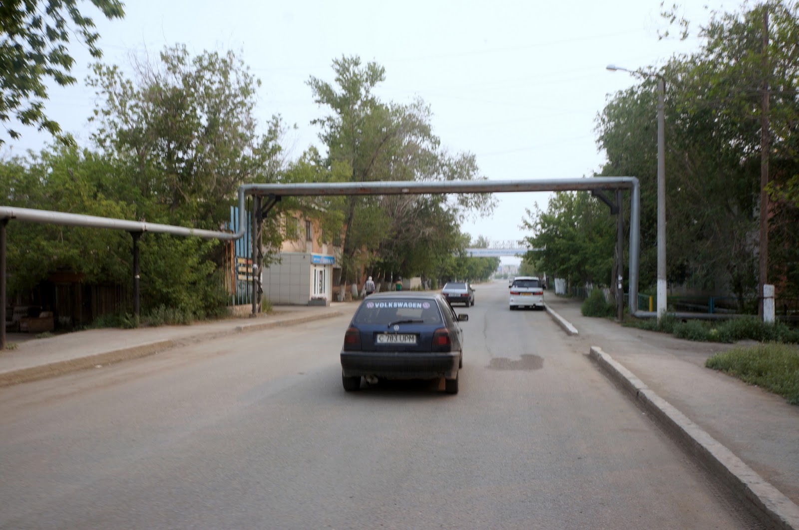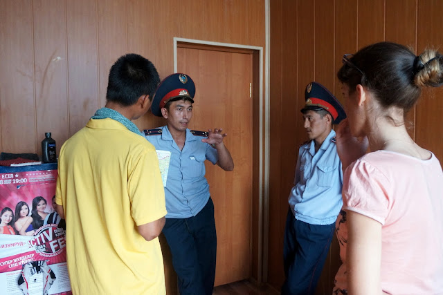 終於安頓下來後,來了兩位一整個老實樣的警察來找我們登記護照資料。其中一位會說英語,感覺對我們的旅行很有興趣,我們也就分享這幾天在哈薩克碰到的驚奇故事,尤其是和警察有關的。 不知道是不是有比較心理的關係,兩位警察討論後竟然說要帶我們去附近晃晃!