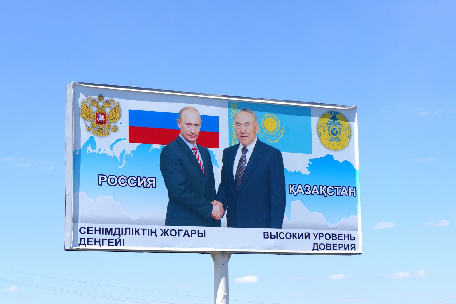 口岸邊放了一幅巨型看板,有趣的是上面有兩位總統任期都超長,加起來幾乎接近半百,分別是俄羅斯總統普丁以及哈薩克總統納扎爾巴,瞧他們的樣子就知道兩國關係匪淺。其實對於這兩國的印象都還停留在前蘇聯的共產體制之下,出發前慢慢去整理一些關於各國資料才驚覺到,這些國家都已經開始實行民主體制了!