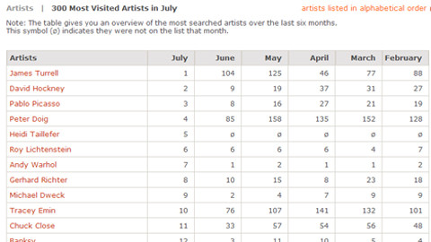 8月初,著名藝術網站art.net統計半年來搜尋引擎上,全球藝術家被搜尋的次數,列出全球藝術家排行榜。今年7月,art.net全球藝術家300大,由James Turrell(特瑞爾)、David Hockney(霍克尼)、Pablo Picasso(畢卡索)奪下前三名。