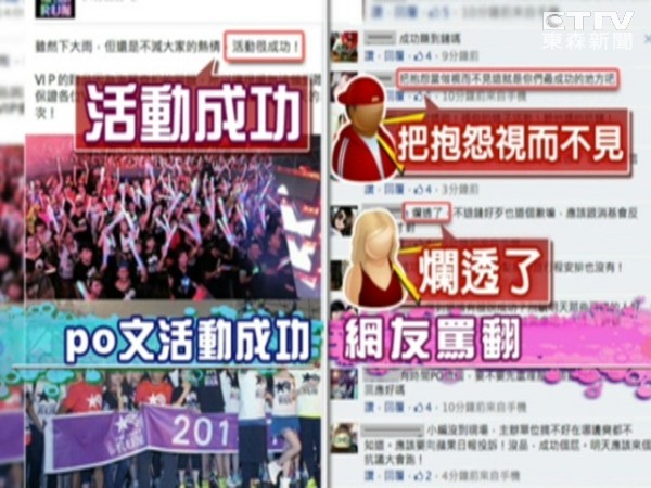 網路上一面倒批評,主辦單位還PO文慶功,網友噓聲不斷諷刺主辦單位根本是賺錢賺得很成功,爛透了!退費連署召集人潘先生說:「宣傳的跟國際派對,但實際根本像是2人公司辦小活動,應該說像詐騙吧!比較高明的詐騙手段。」因為這場路跑吸引近2萬人參加,扣掉開銷和雜支獲利高達上千萬,實在賺很大。