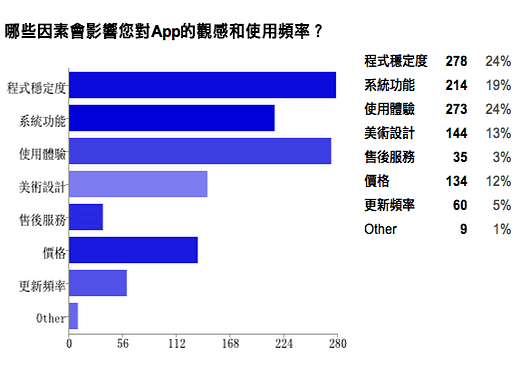 最後,問到有哪些因素會影響使用者對App的觀感和使用頻率?答案揭曉,程式穩定度最多人勾選,和使用體驗以24%並列第一,其次是系統功能、美術設計和 價格。這也再次說明消費者已經不再以價格作為主要的下載決策依歸了,社會大眾更在乎的是App的穩定度,以及使用體驗是否良好?甚至,App的設計感也很 重要,會左右消費者的下載、使用意願。