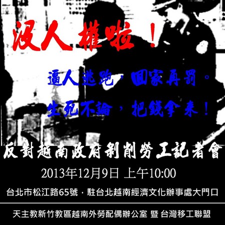 天主教新竹教區越南外勞配偶辦公室暨台灣移工聯盟各會員,19日集結於駐台北越南經濟文化辦事處門前,抗議越南政府血腥剝削輸出勞工,不但放任國內仲介收取超額仲介費,並對海外逃跑的外勞,處以高額罰金再剝一層皮,對越南勞工而言無疑是落井下石。