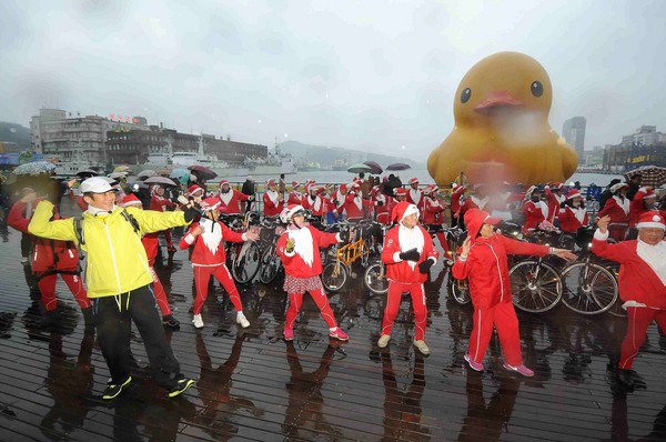 首創「老老介護,老而不休」理念的傳神居家照顧協會,趕著黃色小鴨熱潮,由30位老不休單車隊騎士與30位啦啦隊成員,扮成耶誕老人,24日在14度的寒流低溫下,從台北一路騎車到基隆造訪黃色小鴨,25還將探訪暖暖仁愛之家及關渡浩然安養院,在寒冬中為其他老人帶來溫暖與關懷。
