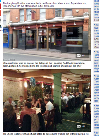有這麼糟?英國肯特郡日前發生一件集體吃「霸王餐」的事件,一間中國餐廳「笑佛餐館」(Laughing Buddha)來了43名客人,但他們因不滿的服務品質差,大鬧餐廳,最後竟然全體不付錢就走人,讓店家損失了超過1100英鎊(約台幣5.5萬元)。
