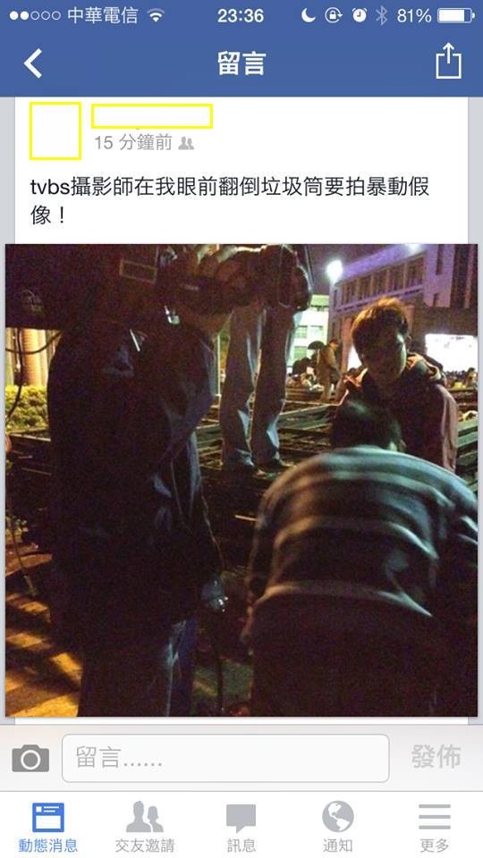 批踢踢實業坊(ptt.cc)八卦版(Gossiping)24日流傳一張臉書照片,指控「TVBS攝影師在我眼前翻倒垃圾筒要拍暴動假象 !」 TVBS新聞部24日1點49分發出澄清稿,表示「實為工作人員拉線時不小心踢倒垃圾桶後扶正時所攝。」