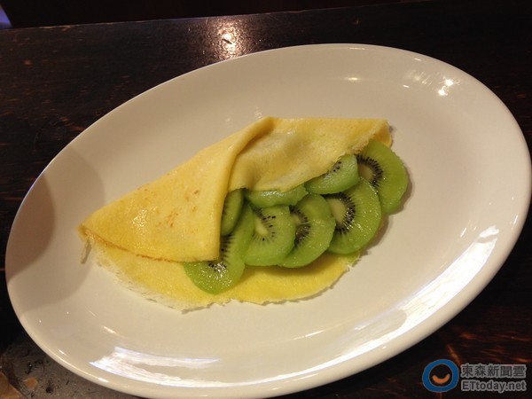 第二步則是將鮮奶油倒入小湯鍋中以中火加熱,輕輕攪拌加熱但不煮滾。同時,大碗中要放入香草與剁碎的巧克力,然後將熱鮮奶油淋入使其溶化;緊接著將不沾平底鍋以中小火加熱,並加入少許融化奶油,淋入足夠的麵糊後搖晃填滿鍋面開始翻煎,最後在裝飾煎餅上,將適量的奇異果片放在煎餅上然後捲起(▲▼圖/記者陳弘修攝),淋上巧克力醬,再用薄荷葉和榛果進行裝飾,一道美味又健康的甜點就可以上桌了。