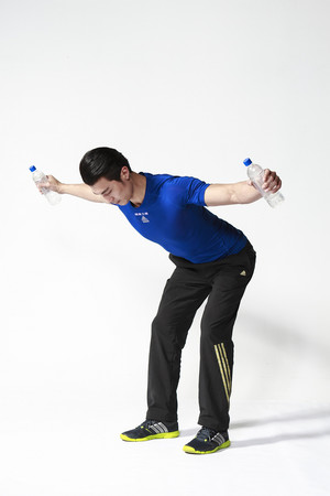 【動作2】此時,雙手持水瓶向兩側展開,向上抬起,抬至水瓶高度後,再回到垂直地面的位置。 【提醒】向下停留3秒,上舉停留2秒,單組15~20下,共做3~4組。