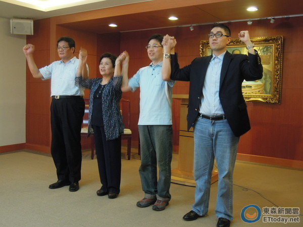▲謝國樑(右)、徐少萍(左二)為謝立功加油。(圖/記者賴映秀攝)