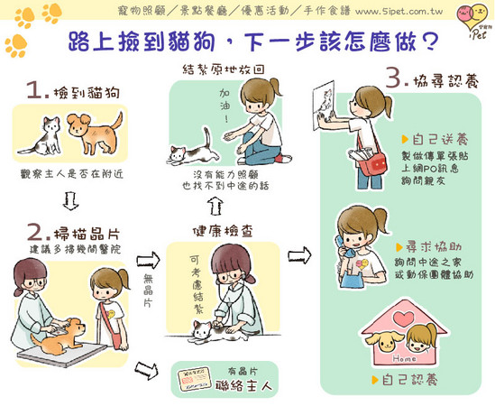檢查完畢後,可暫時將貓狗安置於家中,同時印製送養/協尋海報張貼於社區公布欄、附近的動物醫院、商家等,FB、網路論壇等也是很好的露出管道,亦可尋求【iPet愛寵物】協助,請毛小編幫忙分享訊息。