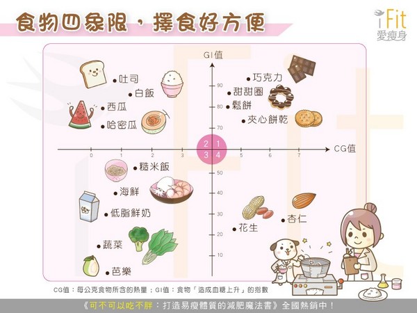 ※ GI值為升醣指數(Glycemic Index),簡單來說就是一種食物「造成血糖上升」的指數,數值若超過「60」即為高 GI 食物;Cg值為「每公克食物所含的熱量」(Calorie/g),若數值「超過 4」,即為熱量偏高的食物喔!