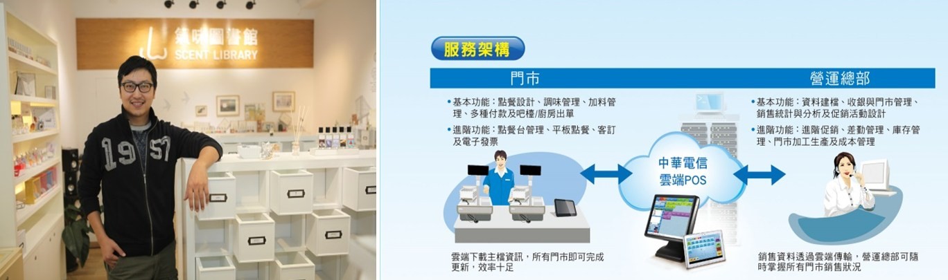 ▲匯晟國際事業王佑宸經理(圖左)表示,中華電信雲端POS簡捷便利的操作介面,提高店內服務效率;中華電信雲端POS(圖右)連接門市與營運總部,隨時掌握門市銷售狀況,上線即可輕鬆管理前台與後台。(圖/中華電信提供)