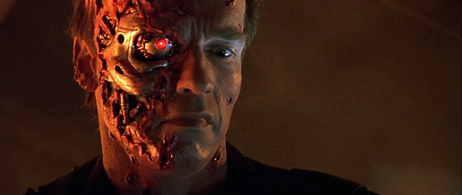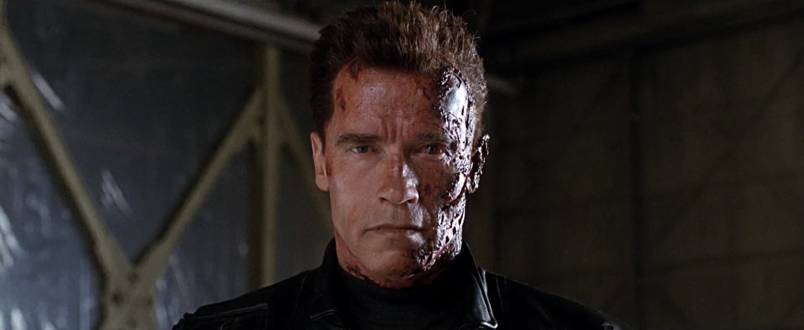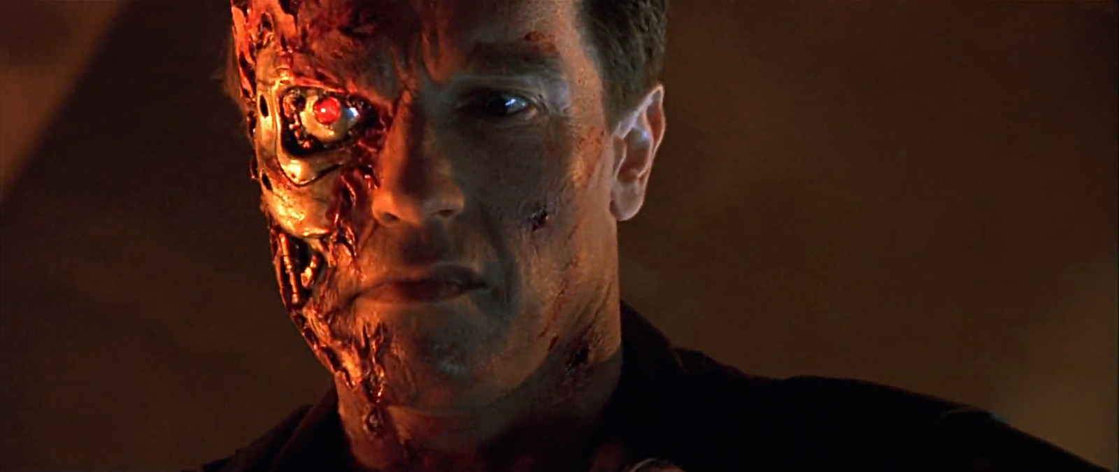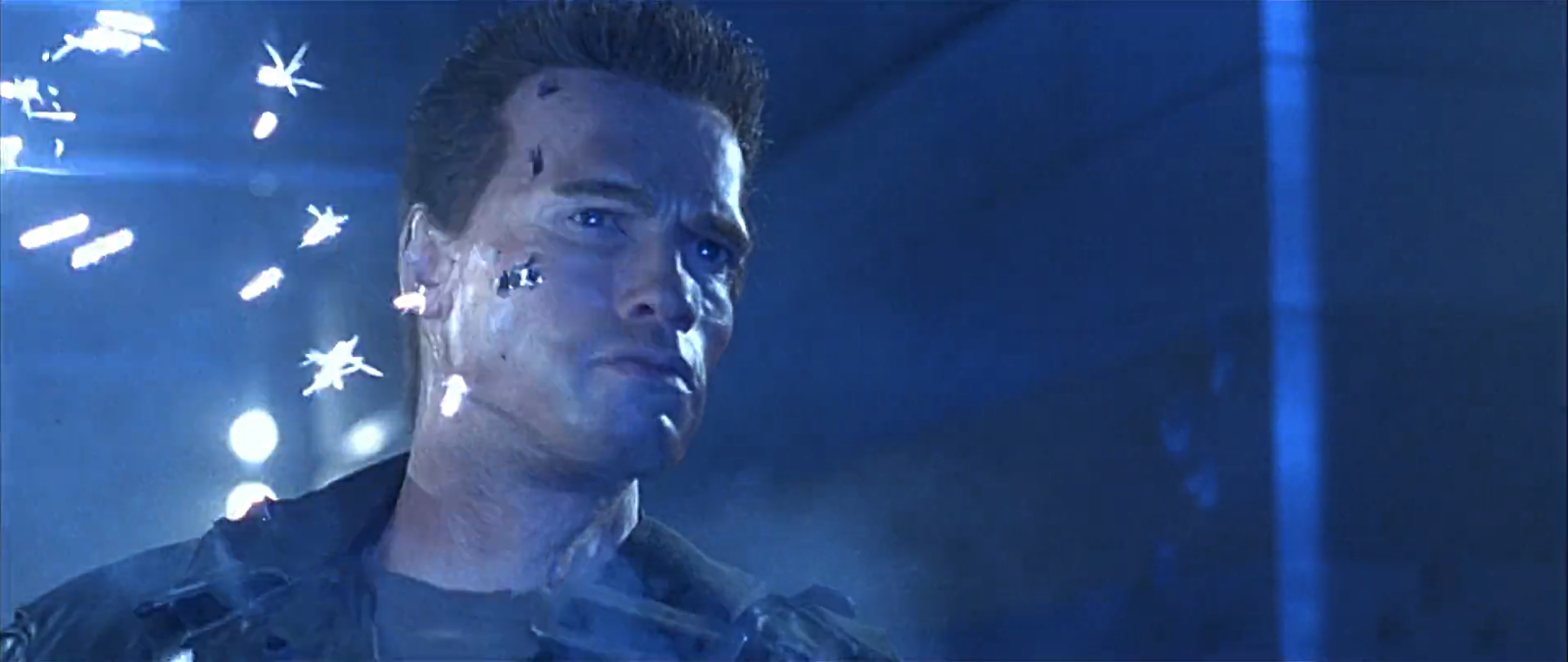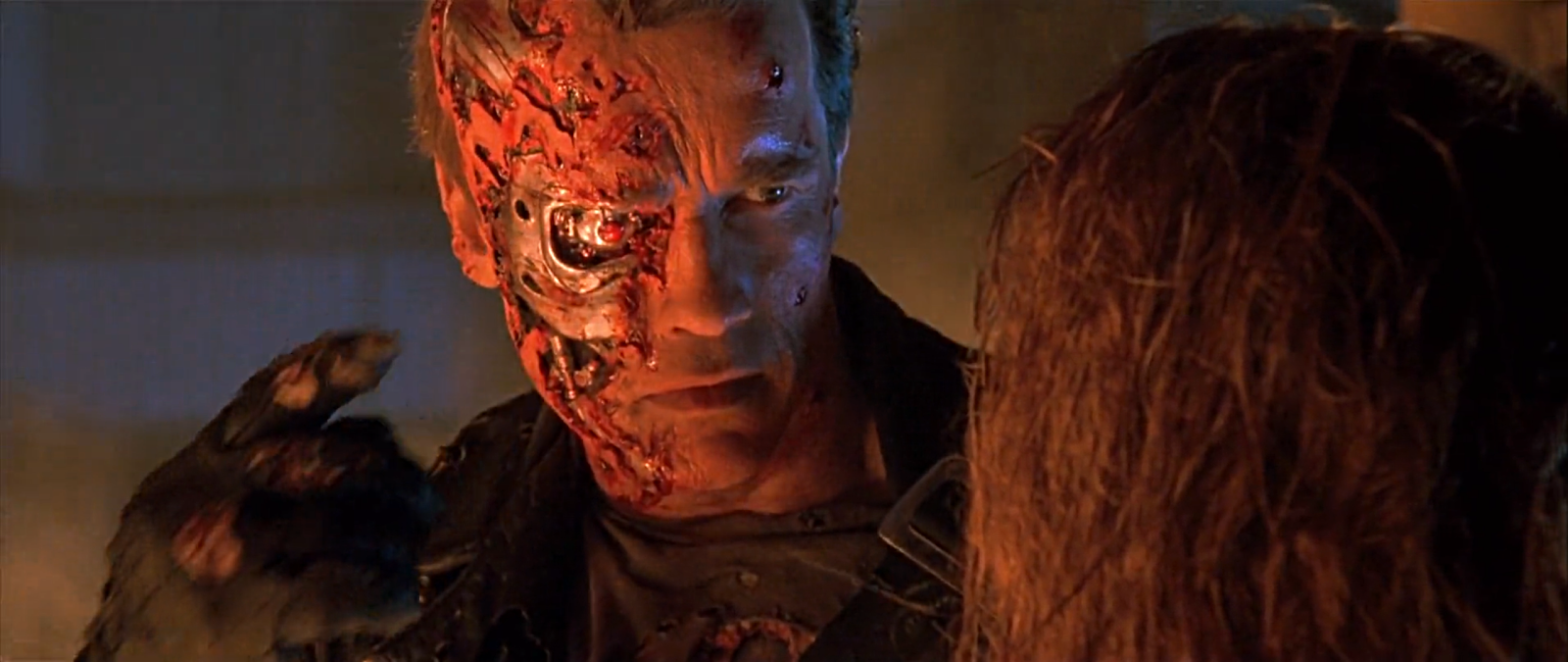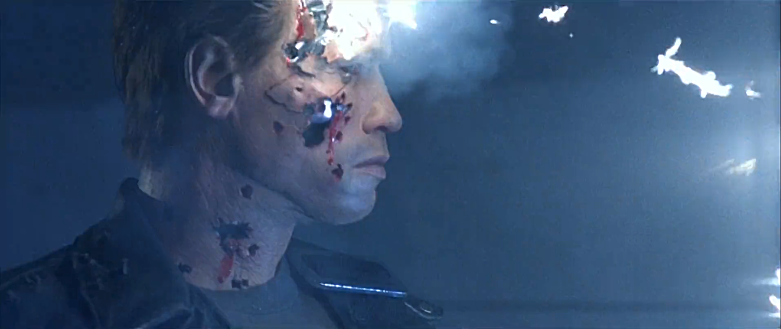 這一集當阿諾跟警方正面衝突,遭到警方連環槍擊厚,面部皮膚組織開始受損。