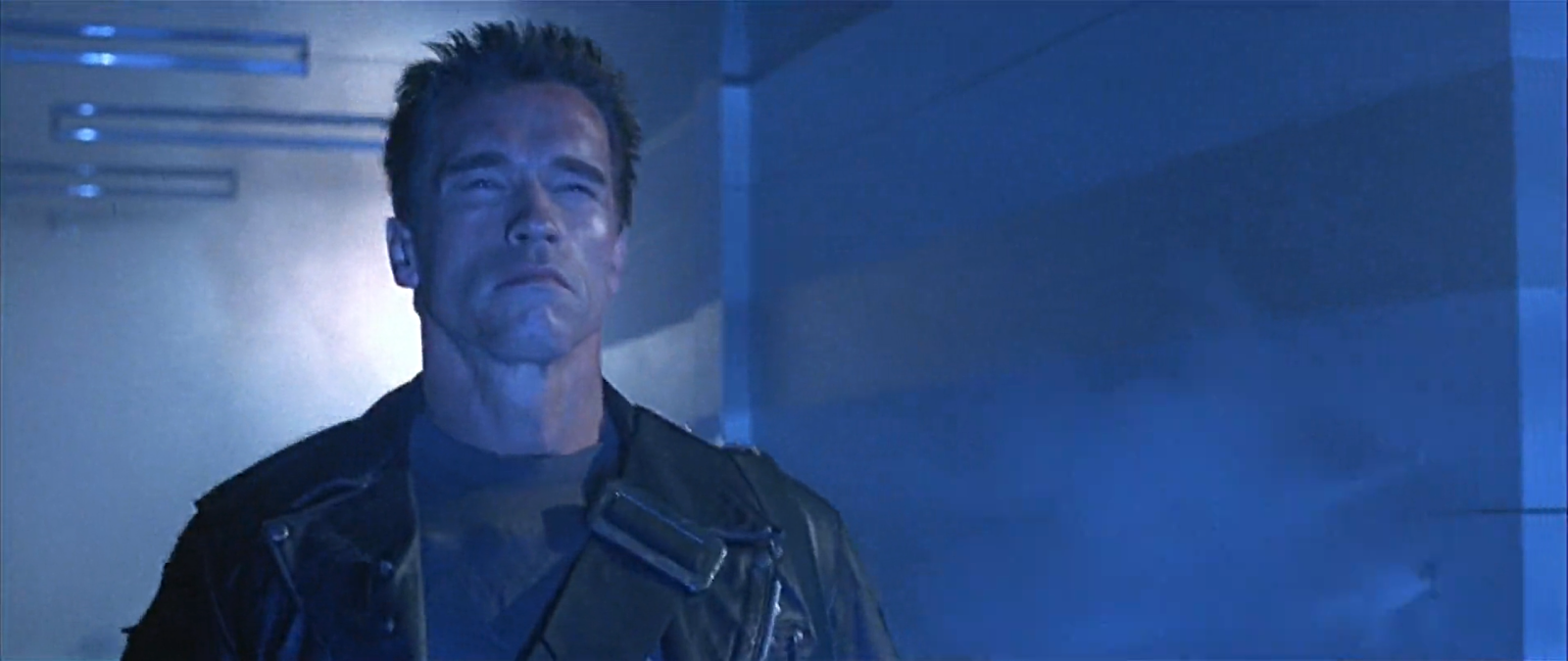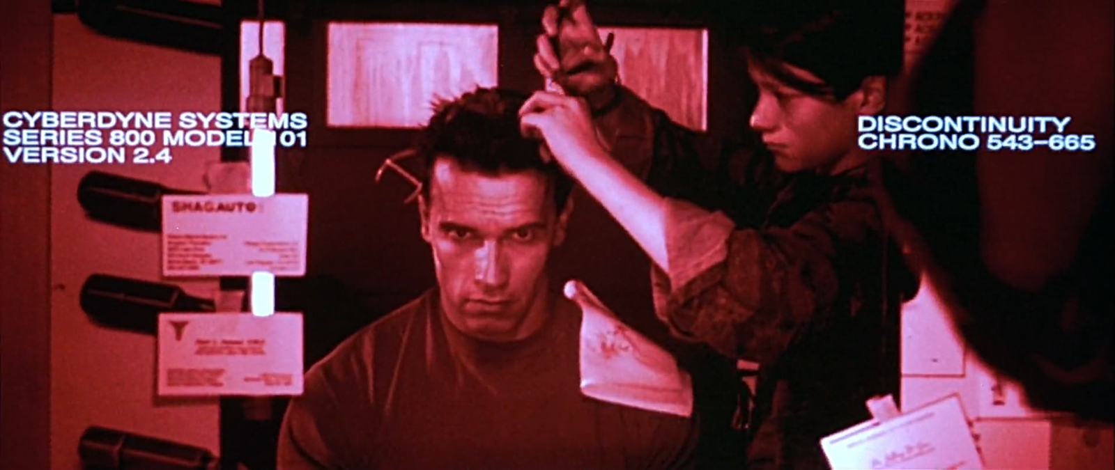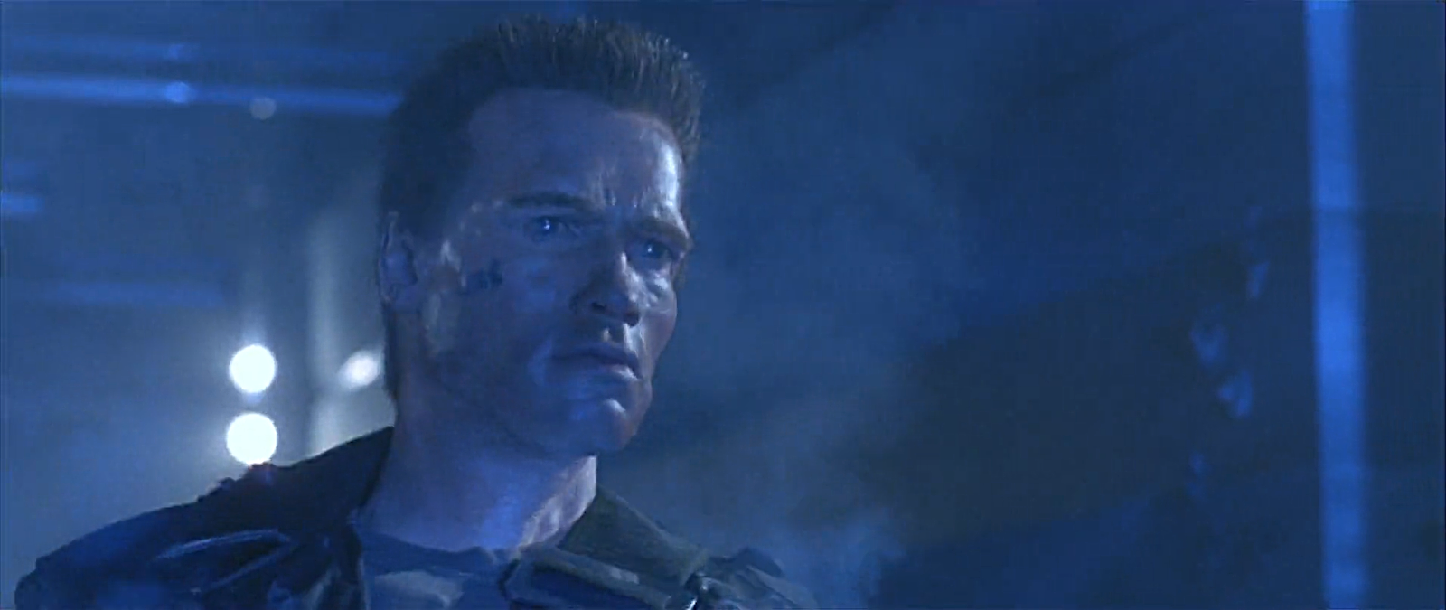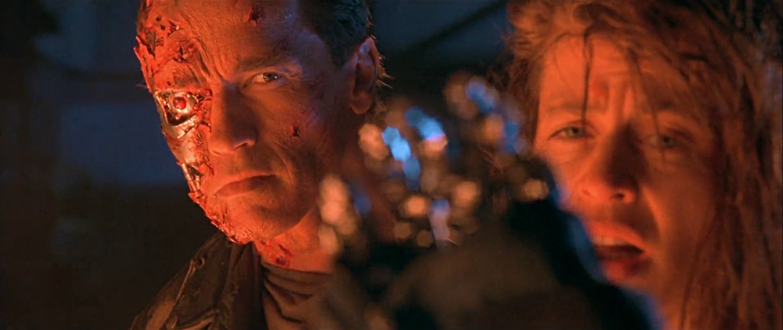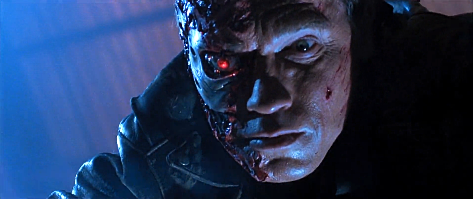 這一集當阿諾跟警方正面衝突,遭到警方連環槍擊厚,面部皮膚組織開始受損。