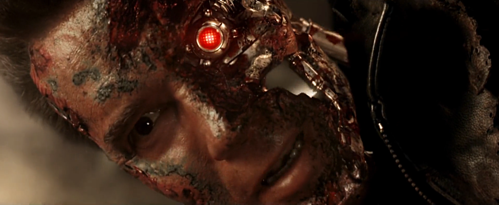 拆完眼球,露出終結者的內部骨架與發出紅光的眼睛,這裡就讓觀眾覺得無比過癮!機器人出現了!不過其實也很明顯不太像真人了。