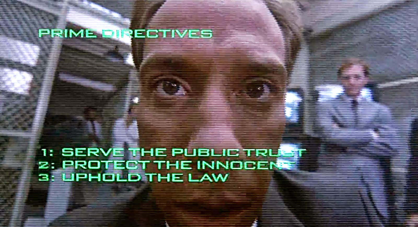 這是終結者眼睛看出去的畫面,總是紅紅的,然後會出現一堆指令與資訊,不過這比較像是給人類看的,因為終結者本身就是電腦機器人,理應不需要再「看到英文指令或數據」才能去行動,另外像是機器戰警也是一樣,眼前會出現指令畫面,如下圖。