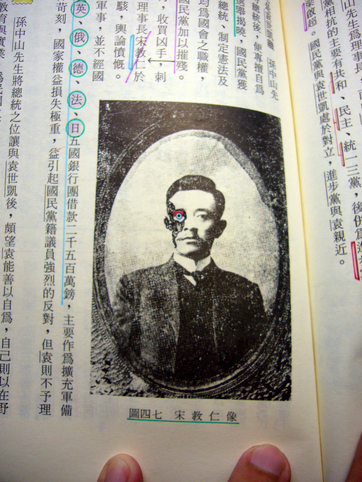 這個終結者妝其實影響了不少影迷,很多人喜歡在人物的臉上畫上這種「機械外露」的細節模樣,我也曾畫在台灣聯考時代的高中歷史課本上: