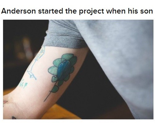 從兒子4歲作畫開始,幾乎每年Keith Anderson就把兒子的塗鴉創作移到自己的手臂上,不管是童趣風格的房子、可愛的動物、或是一些奇形怪狀的圖案,都是他無價又獨特的刺青圖案,而這些刺青不僅透露出父子間的感情,也見證了兒子的成長歷程。