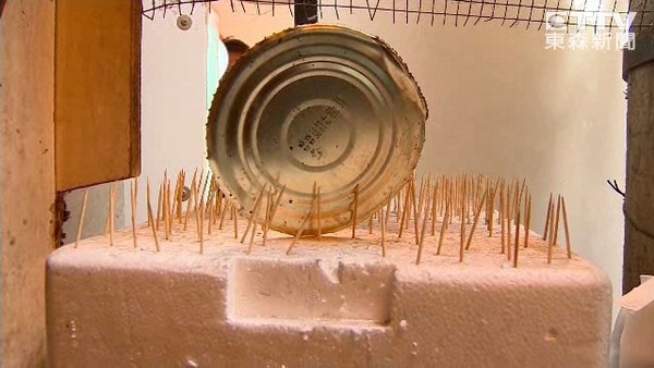 走進廟東夜市,店家門口放了保麗龍板,但上頭卻是插滿牙籤,甚至連罐頭鐵片也放上去;另一間賣大腸麵線的一樣出動牙籤毯放在冰箱上,這些「裝備」都是拿來防止流浪貓跳到攤販上的利器。