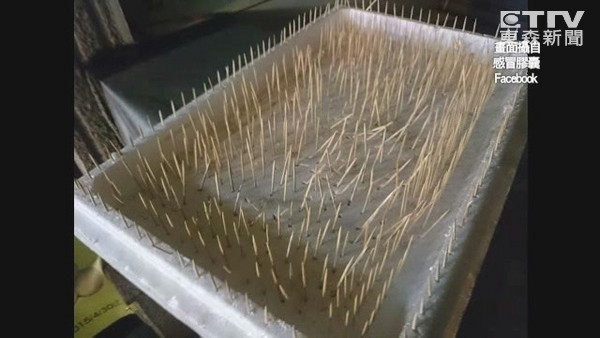 台中豐原的廟東夜市時常有野貓出沒,有店家自製「牙籤毯」,就是在保麗龍上插滿牙籤,擺放在吧台或是攤販上,用來驅趕野貓,當地居民發現後立刻報警處理,愛貓人士更批評這已觸犯《動保法》,如果造成貓咪受傷,就是虐待動物。