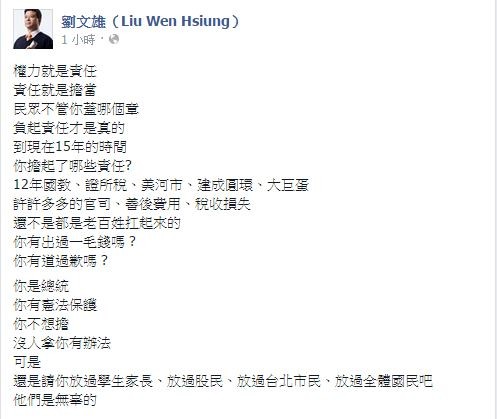 劉文雄在臉書PO文表示,權利就是責任,責任就是擔當,民眾不管你蓋哪個章,但負起責任才是真的。更質疑馬英九執政15年到底擔起哪些責任?12年國教、證所稅、美河市、建成圓環,甚至大巨蛋等的官司,所有善後費用及稅收損失都是老百姓扛起來的,總統一毛錢也沒出,甚至連一句道歉也沒有。