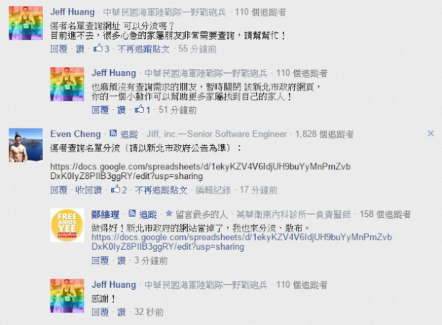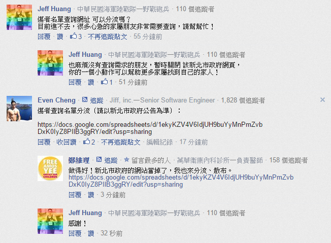 掌握最多傷患名單的新北市消防局,一公布名單,網站立刻流量太大當機,完全無法讀取,且PDF檔不易搜尋。鄉民們發揮熱血鍵盤戰士,自製google表格,搜尋教學,即時更新名單,加上共同編輯,讓家屬們透過網路能即時清楚得知第一手資訊,覺得感人!