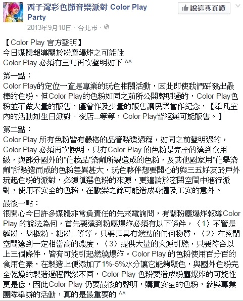 Color Play Asia - 彩色派對 主辦單位已舉辦四屆活動,深知粉塵爆炸危險性,於2013.09.10大動作發表聲明,對媒體以專家角度自稱安全。